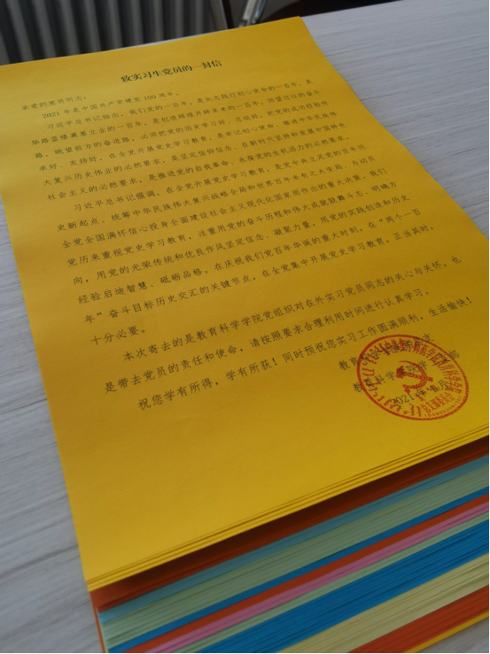 “红色快递”寄去的是教育科学学院党组织对在外实习的学生党员的关心与关怀,也带去了党员的责任和使命。在《教育科学学院党总支致实习生党员的一封信》中,说明了党史学习教育的重要意义,对在外实习的学生党员们提出了学习要求,同时提出了对实习生党员学有所得,学有所获的美好祝愿!