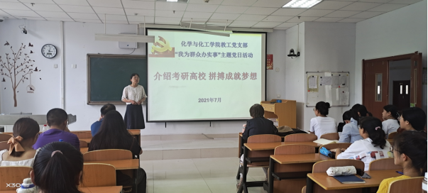 为庆祝中国共产党成立100周年,深入贯彻习近平总书记重要讲话精神,按照学校党委《关于开展党史学习教育的工作方案》要求,7月7日,beat365在线唯一官网化学与化工学院教工党支部开展了“我为群众办实事”主题党日活动,本次主题党日活动的主题为“介绍考研高校 拼搏成就梦想”,特意邀请了化学与化工学院党总支书记李荣和学工党支部岳彩霞参加此次活动,教工党支部全体党员和各年级有考研意向的学生参加了此次党日活动。本次党日活动为化学与化工学院的考研学生选择考研高校和进行考研学习答疑解惑。