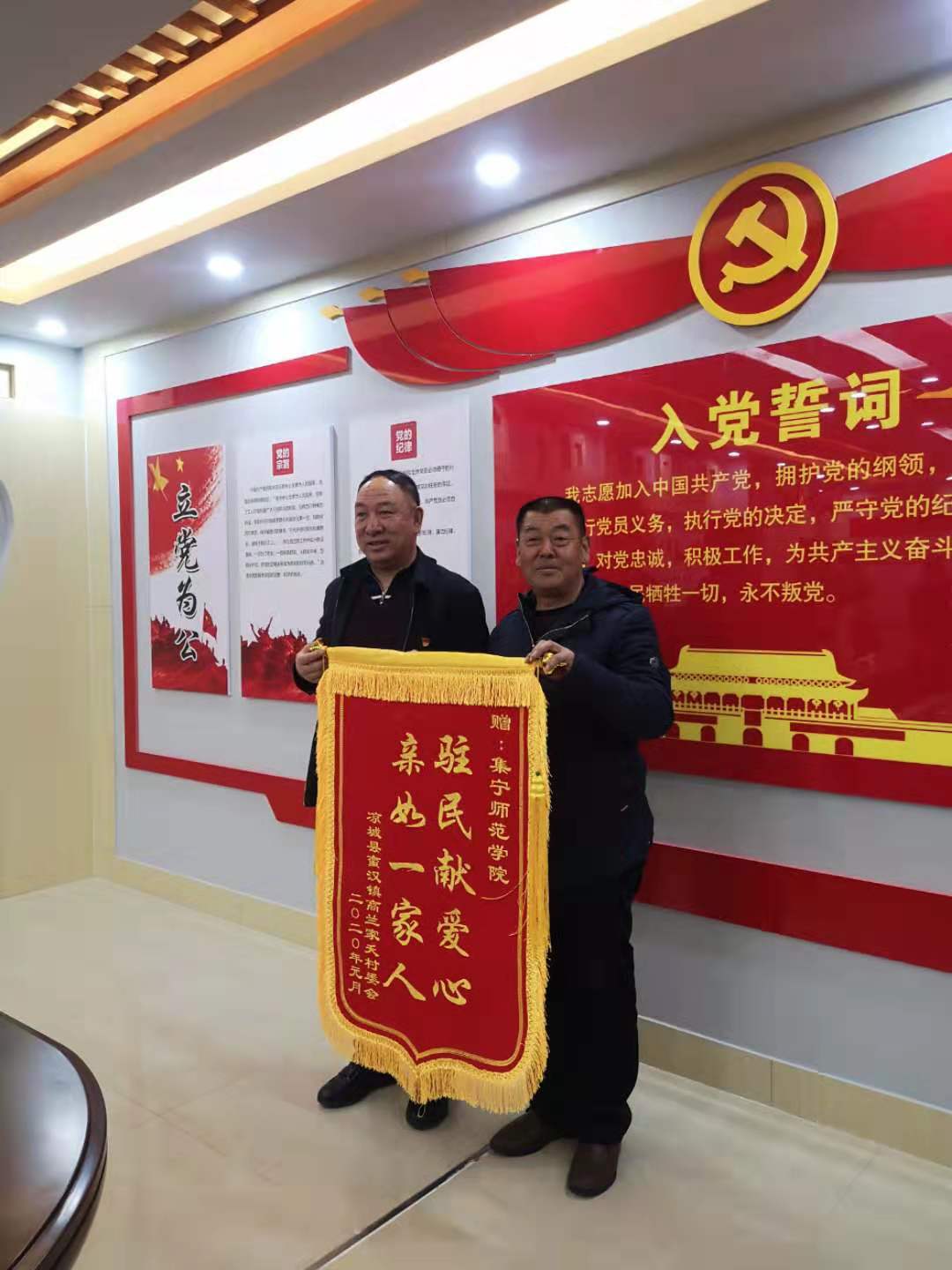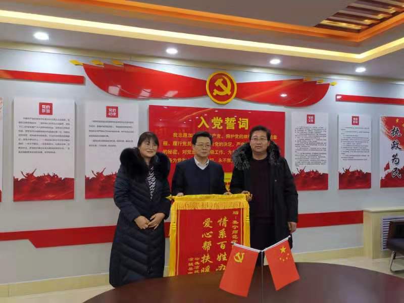 最后,校领导与蛮汉镇政府、左卫夭村、高兰家夭村代表举行了赠送锦旗仪式。