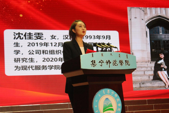 现代服务学院教师沈佳雯作为新入职教师代表发言。她表示,作为一名刚踏上教师岗位的新人,要在学校、领导和同事们的关怀和帮助下,尽快成为一名合格的优秀教育工作者,要不断学习,提升专业能力与品德情操,做到爱岗敬业、团结奉献,为学校发展贡献力量。