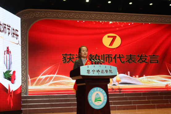 文学与新闻传播学院教师胡锦博作为师德标兵代表发言。她表示,作为教师,要热爱教育事业,要关爱学生,以丰盈的知识技能充实学生,以平等民主的态度关爱学生,以优良的品德影响学生,全心全意为教育事业贡献自己的力量。