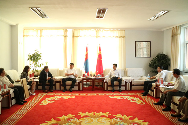 6月12日,蒙古国乌兰巴托大学校长、博士、教授斯·白嘎力赛汗及其夫人乌·萨仁其其格在现就读于乌兰巴托大学的巴德仁贵博士的陪同下来beat365在线唯一官网访问交流。校长朱玉东会见斯·白嘎力赛汗一行并与其座谈。副校长许卫,院长助理、院长办公室主任欧军,蒙文系相关负责人参加座谈。