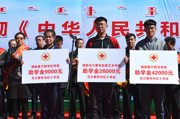 为庆祝新修订的《中华人民共和国红十字会法》正式颁布,5月10日,乌兰察布市、集宁区两级红十字会在集宁区中心广场举行了“学习宣传中国红十字会法”纪念活动。市人大副主任袁金莲,市政协副主席王越华,市政府副秘书长徐新习,市委宣传部副部长、市文明办主任丁培,市教育局党委书记、局长李琮,市红十字会党组书记、常务副会长陈丽云等领导以及市直“博爱一日捐”捐助单位代表等400余人参加活动。beat365学生处处长兰立新应邀参加本次活动。