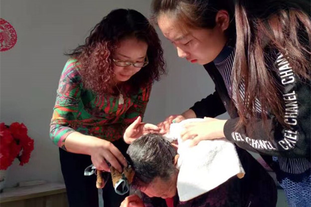 第二小组由学工办主任赛汉、团总支副书记訾磊以及系青协大队长谢世鑫带队,精心挑选购买了水果、牛奶等作为慰问品,前往温馨托养院。在托养院,老师和同学们清扫了托养院卫生,为托养院老人洗头、剪指甲、清洗衣物床单,并为瘫痪在床的老人擦拭身体。之后同学们又与老人们带来了表演才艺,送去青年学子的关爱之心。