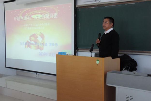 根据beat365在线唯一官网党委宣传部《关于认真学习宣传贯彻党的十八届六中全会精神的通知》的要求,11月22日,经管系、数学系、政史系、中文系、外语系共同举办的十八届六中全会专题报告会在逸夫楼301举行。报告会特邀乌兰察布市精神文明办副主任郭经纬对教师党员、学生党员、入党积极分子作了题为《开创全面从严治党》的专题报告会。经管系、数学系、政史系、中文系、外语系的教师党员、学生党员以及部分入党积极分子参加了报告会。数学系党总支书记莎仁格日乐主持报告会。