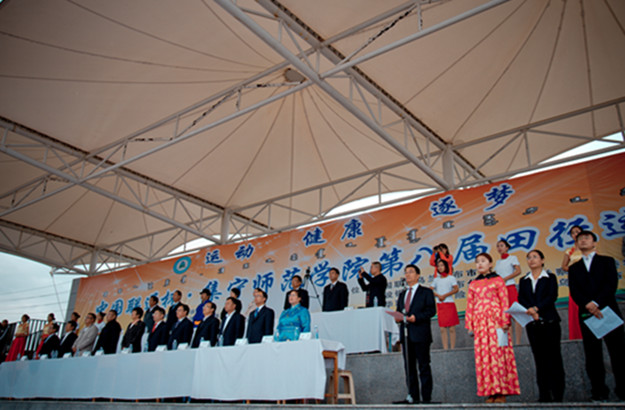 伴随着雄壮的运动员进行曲,校国旗班、军乐队、彩旗队、花束队、裁判员代表队及各系(院)运动员代表队依次入场。党委书记刘前贵宣布beat365在线唯一官网第八届田径运动会白海校区分会开幕。党委副书记赵海忠致开幕辞。运动员代表、裁判员代表庄严宣誓。开幕式上,白海校区师生共同观看了由音乐系带来的小合唱——《为祖国干杯》,蒙文系的安代舞表演以及幼师学院的团体操表演。