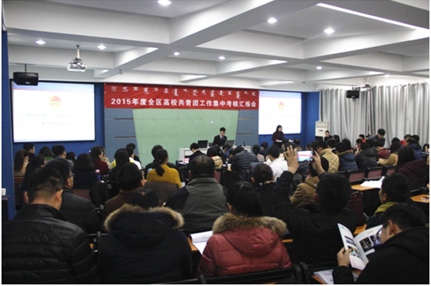 为进一步贯彻落实中央和自治区党委党的群团工作会议精神,根据《2015年全区共青团学校工作要点》、《2015年全区高校共青团工作评估考核项目指标》,全面掌握和评价2015年全区高校共青团工作,推动全区高校共青团工作深入发展,12月26日,自治区团委在内蒙古大学举办了2015年度全区高校共青团工作集中考核汇报会。自治区团委副书记陈晓东出席汇报会,出席汇报会的还有全区高校团委书记、驻呼高校团总支书记代表、团委干事代表以及学生会主席代表共120人,自治区团委学校部部长齐斯琴主持汇报会。