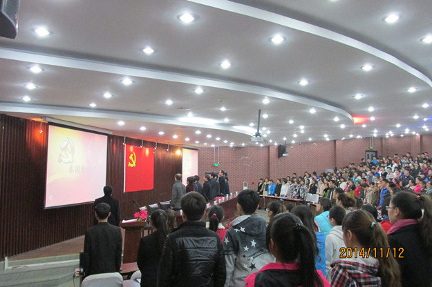 11月12日下午4:00,由组织统战部主办、政史系党总支承办的政史系、中文系、外语系、经管系和音乐系空乘专业2014—2015学年第一学期党课培训开班典礼在图书馆学术报告厅隆重举行。校党委书记谭福贵,党委副书记、纪委书记张利平,党委副书记赵海忠,党委委员、组织统战部部长朱俊仙、副部长海棠,政史系党总支书记兰林世、中文系党总支书记张来锁、外语系党总支书记王玉英、经管系党总支书记周关锁、音乐系党总支书记王汉君以及相关系党总支副书记、学生支部书记和369名培训学员出席了开班典礼。