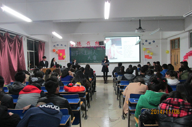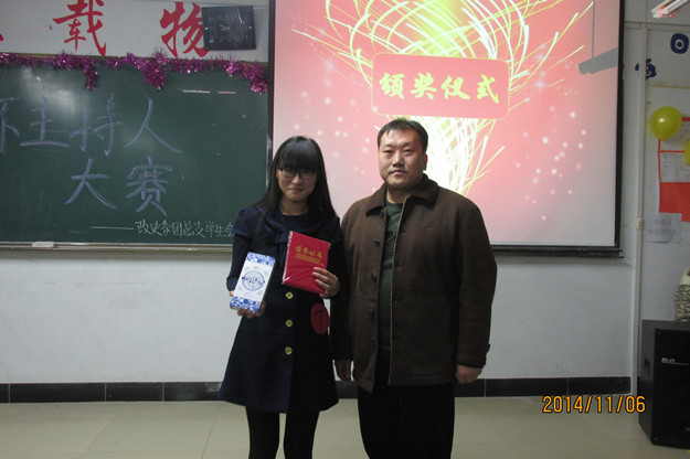 比赛共分为自我介绍、才艺展示、即兴评述、模拟主持四个环节。10名参赛选手依据抽签顺序分别进行展示。比赛持续了2个小时,经过紧张激烈的角逐,最终评选出一、二、三等奖。其中2013级地理科学班李春蕾荣获一等奖,辛飞为获奖选手颁奖并合影留念。