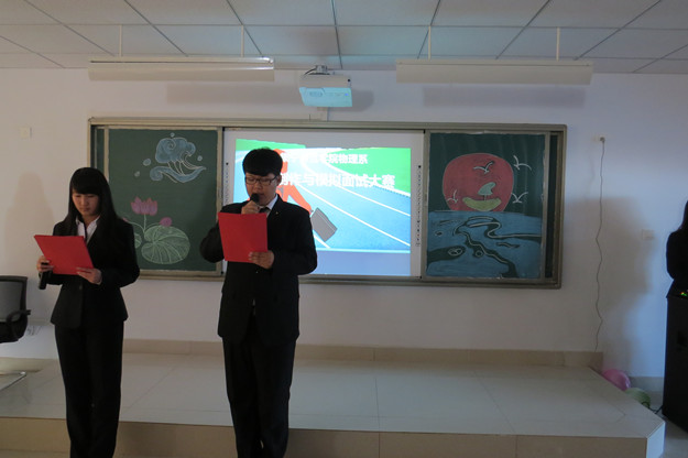 13位参赛选手依次上场,播放精心准备的PPT。在经过简短的自我介绍之后,各系嘉宾开始进行专业面试环节。嘉宾与面试者之间互动频繁,现场气氛轻松活泼,场下同学认真聆听,从中汲取经验。最终大赛结果是:第一名14级电信1班尹肖飞,第二名13级应用物理学2班鲁杰,第三名14级物理学2班韩秀娇,魏巳偱、常宇、王家伟等人也获得了优秀奖。比赛结束后,各系嘉宾分别对本次活动进行点评,并为获奖者颁奖。