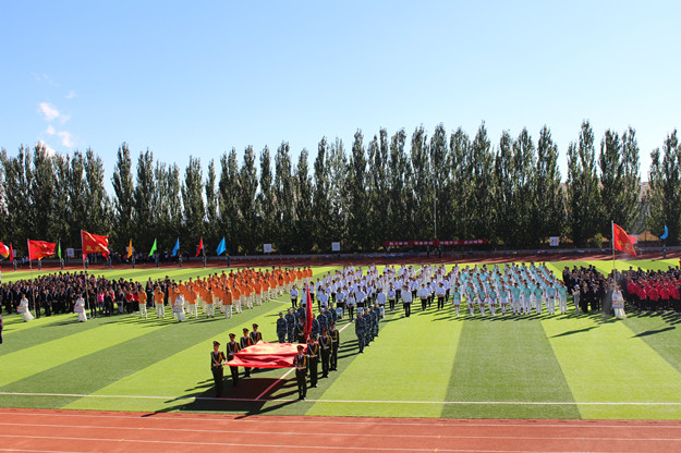 伴随着激昂的运动员进行曲,国旗队、鼓乐队、彩旗队、裁判员代表队、各系运动员代表队和各部门教职工代表队身着统一服装,迈着矫健的步伐进入了运动场。