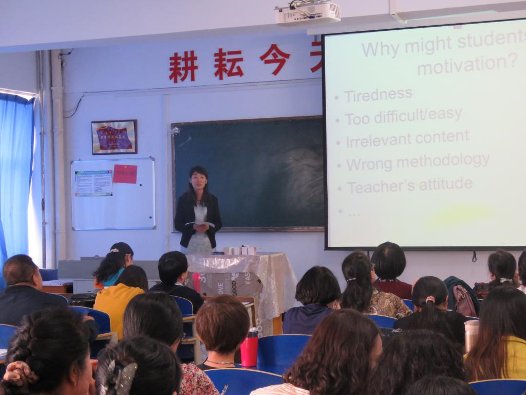 袁晓伟分享的主题是学生心理与学习动机。主要分析了影响学生学习的多种因素,探讨了根据学生实际情况,教师在言行和教学方法方面如何激发学生的学习动机。通过分享,使老师们更进一步理解了教师在钻研教材、设计教学思路、选用教学方法的同时,还应关注学生的需求、个体差异和心理。乔晋芳分享的主题是科技在语言教学中的使用(Technology in Language Teaching)。详细介绍了英语教师备课资源的网站以及如何利用手机App将线下教学与线上学习相结合,并在现场作了示范。