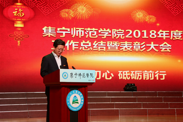 朱玉东回顾了2018年学校的重要工作,他指出,这一年学校坚持以永远在路上的执着,深化巡视整改工作,不断推进全面从严治党走向严紧硬;坚持正确用人导向,不断加强队伍建设;坚持把思想政治工作贯穿教育教学全过程,努力开创思政工作新局面;坚持以转型发展为抓手,大力推进内涵建设,人才培养质量进一步提升;坚持以人为本,体现精细化服务,扎实做好后勤管理和安全稳定工作;积极推进开放开门办学,对外交流合作成效显著。
