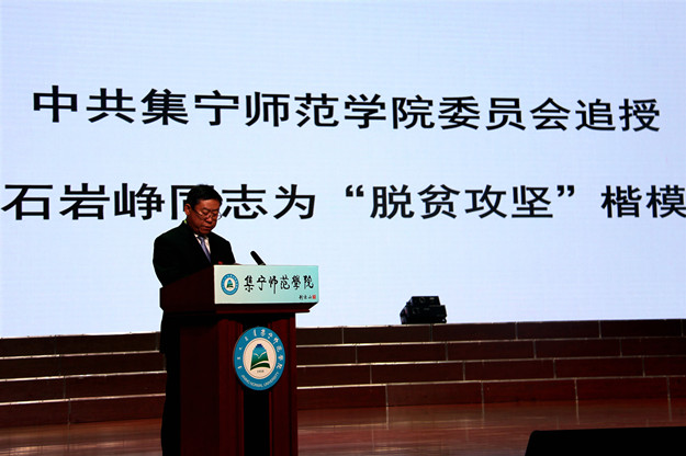 张利平宣读《中共集宁师范委员会关于追授石岩峥同志“脱贫攻坚”楷模的决定》,追授石岩峥同志为“脱贫攻坚”楷模刘前贵为石岩峥家属颁发证书和慰问金。