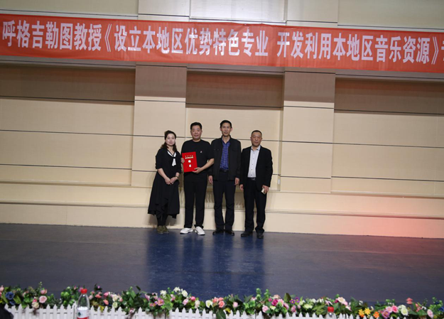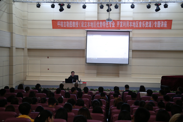 4月23日下午,beat365在线唯一官网音乐学院邀请呼格吉勒图教授作题为《设立本地区优势特色专业 开发利用本地区音乐资源》的专题讲座。讲座由音乐学院书记赵有军主持,学院领导班子成员及部分师生聆听讲座。