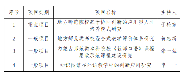 根据自治区教育厅《关于开展2022 年本科教学改革研究项目立项申报工作的通知》精神,经个人申报,二级学院初审,学校组织专家评审,校长办公会议审定,拟推荐“地方师范院校基于协同创新的应用型人才培养模式研究”申报自治区级本科教学改革研究重点项目,推荐“地方师范类高校混合式教学评价体系研究”等3个项目申报自治区级本科教学改革研究一般项目。现予以公示,公示名单见下表: