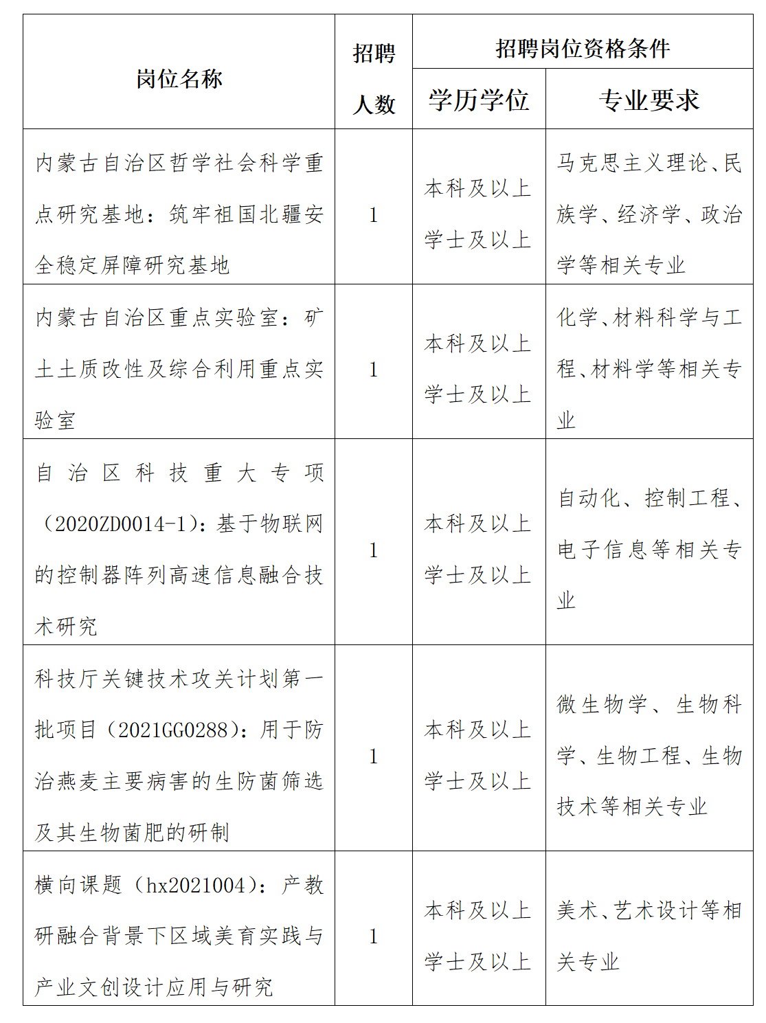 为深入贯彻习近平总书记关于高校毕业生就业工作的重要指示批示精神,落实科技部、教育部、人力资源社会保障部、财政部等6部门《关于鼓励科研项目开发科研助理岗位吸纳高校毕业生就业的通知》(国科发资〔2020〕132号)和科技部“部署开发科研助理岗位工作地方科技管理部门和国家高新区视频会议”任务要求,做好吸纳高校毕业生就业工作,根据内蒙古自治区科学技术厅《关于做好科研助理岗位开发和落实工作的通知》(内科成字﹝2022﹞44号)文件精神和工作安排,现面向社会公开招聘科研助理5名(非事业编制)。