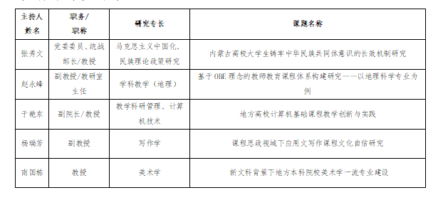 根据内蒙古自治区高等教育学会《关于开展高等教育研究课题立项申报工作的通知》精神,经个人申报,校专家委员会于2022年7月23日进行集中评审,决定推荐“内蒙古高校大学生铸牢中华民族共同体意识的长效机制研究”等 5个项目申报内蒙古自治区高等教育学会课题。现予以公示,具体名单见下表:
