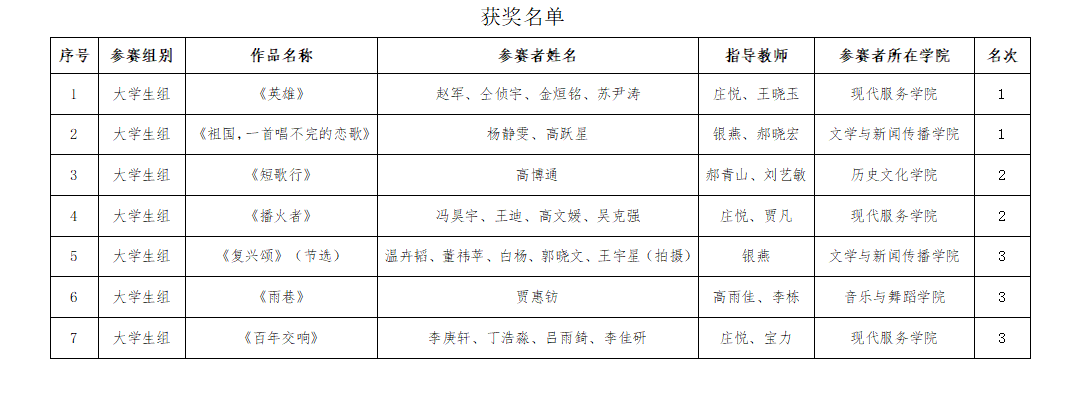 根据《内蒙古自治区教育厅关于组织参加第五届中华经典诵写讲大赛的通知》(内教语用函〔2023〕16号)要求,经二级学院申报,学校评选,评选出一等奖2件,二等奖2件,三等奖3件,拟推荐荣获一等奖和二等奖的作品参加第五届中华经典诵写讲大赛“诵读中国”经典诵读大赛内蒙古自治区选拔赛,现予公示。如有异议,请向教务处反映。