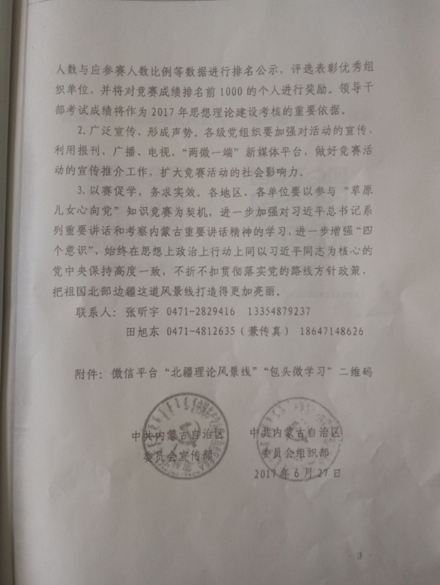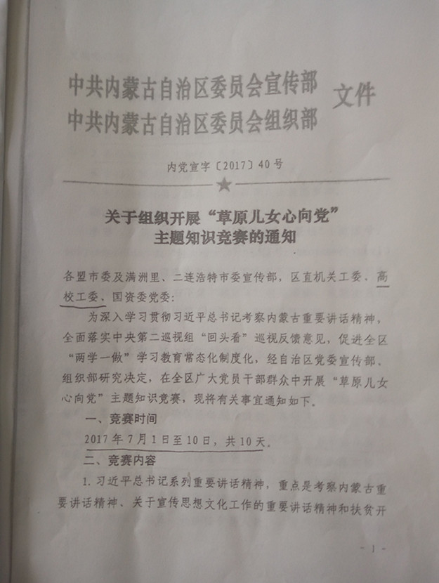 根据中共内蒙古自治区委员会宣传部、中共内蒙古自治区委员会组织部《关于组织开展“草原儿女心向党”主题知识竞赛的通知》(内党宣字[2017]40号)文件要求,为深入贯彻在全区广大党员干部群众中开展“草原儿女心向党”主题知识竞赛,现将有关文件要求转发如下,请严格按文件要求执行。