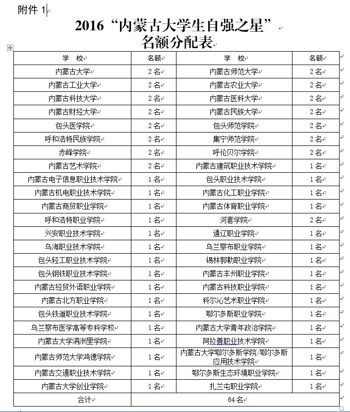 附件:1.2016年寻访“内蒙古大学生自强之星”活动名额分配