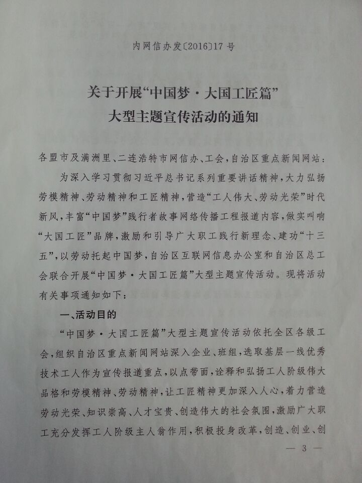为发挥beat365先进文化优势,展现beat365广大教职工热爱祖国、热爱工作、热爱生活、蓬勃向上的精神风貌,落实乌兰察布市互联网信息办公室、乌兰察布市总工会《关于开展“中国梦·大国工匠篇”大型主题宣传活动的通知》精神,现将该通知转发,请参与者在9月15日前将作品报到行政楼506工会办公室。