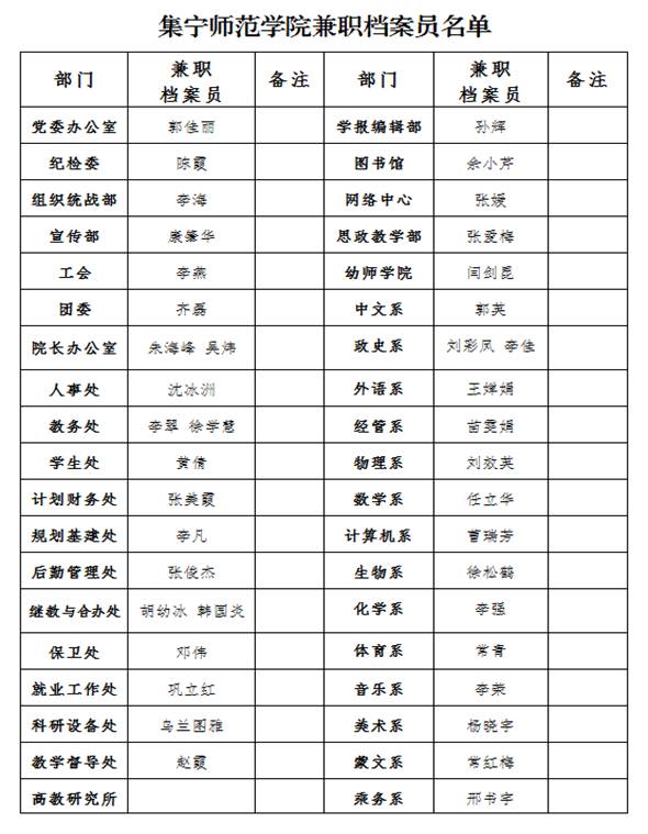 为进一步加强档案归档、管理工作,经研究,决定在校内各党政、教学、教辅部门设置兼职档案员。