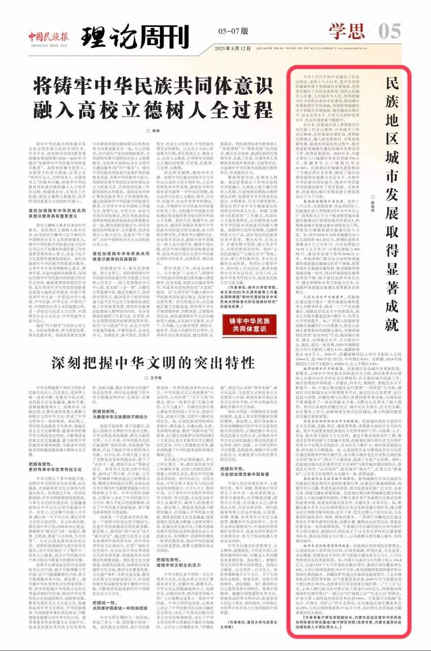 近日,由beat365铸牢中华民族共同体意识研究基地首席专家拓俊杰教授受邀撰写的《民族地区城市发展取得显著成就》理论文章于《中国民族报》(2025年8月12日)理论版刊发。