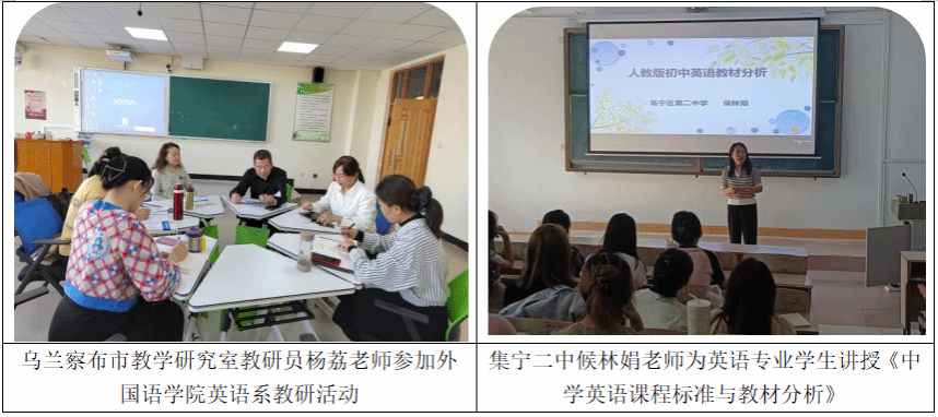 学院与当地教育主管部门和实习基地构建了 “三位一体” 协作育人模式,在教育见习、教育实习、教育研习及实践服务等方面开展密切合作。学院聘请中学教师及英语教研员讲授教师教育类课程内容,采用 “走出去、请进来” 的方式,与乌兰察布市教研室、集宁区实验中学、曙光中学、新星学校等联合开展教研活动,共同听课、评课,研讨英语教学。