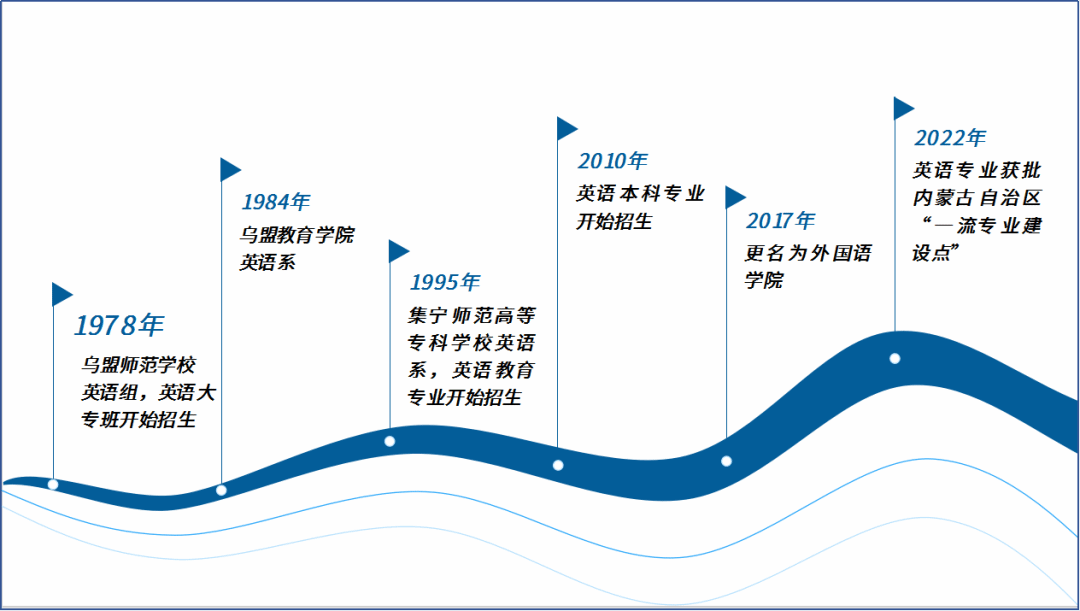 外国语学院始建于 1978 年,其前身为乌盟师范学校大专班英语组,自成立之初便肩负起为地区培养急需英语师资的重任,开启了服务地方基础教育的师范教育征程。历经多年的变迁与发展,在学校晋升为本科院校后,2010年开始招收英语专业本科生。迄今为止,已向基础教育事业输送了 3000 余名德才兼备的优秀英语教师,为乌兰察布及周边地区的基础教育发展作出了重大贡献。