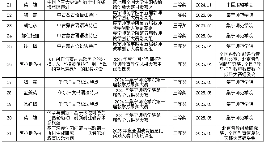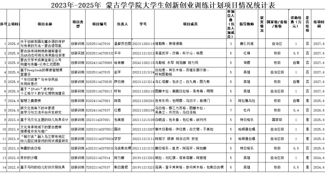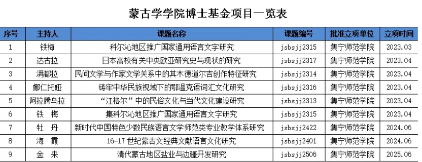 近五年,立项教改课题 21 项、科研课题 28 项,博士基金项目 9 项。教改课题聚焦教学理念创新、教学方法改革以及课程体系优化等关键领域,旨在提升教学质量与人才培养水平。科研课题涉及蒙古语言文化、历史文献、民俗艺术等多个学科方向,深入挖掘蒙古学的丰富内涵与独特价值。博士基金项目为青年学者提供广阔的学术研究平台,推动学科前沿领域的探索与突破。