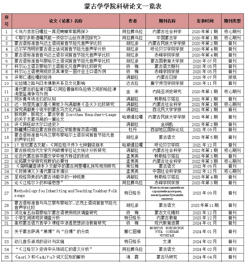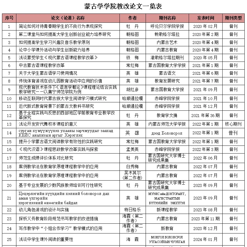 近五年,学院教师在国内外学术期刊上发表论文共 94 篇,其中教改论文 42 篇、科研论文 52 篇,核心论文 11 篇。涵盖蒙古学多个分支领域,从语言的结构与演变、文学的创作与批评到教育教学的理论与实践,进行深入细致的研究与探讨。