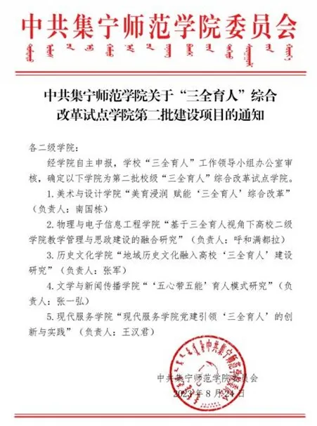 2023年8月,美术与设计学院申报的项目《“美育浸润”赋能三全育人综合改革》获校级‘三全育人’综合改革试点学院第二批建设项目立项,目前已结项。
