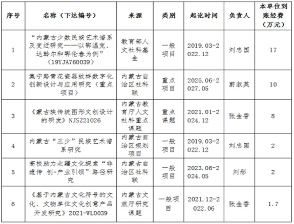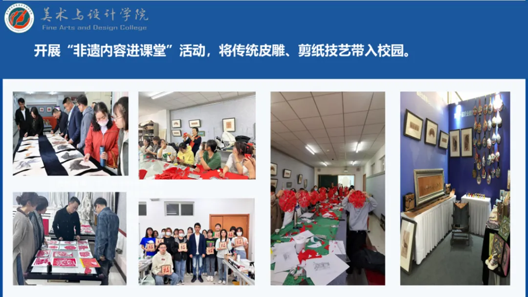 学院立足北疆区位优势,依托乌兰察布多民族交融与非遗资源富集优势,通过高层次艺术人才培养,推动非遗艺术元素的数字化转化与创新性传承,助力文化产业发展与民族艺术保护,努力将内蒙古非遗文化遗产保护与传承融入到校园文化建设和人才培养教育实践之中。近年来,学院依托非物质文化传承与保护研究所,于2022年、2023年、2024年分别获批自治区非遗培训项目(经费60万),聘请非物质文化遗产专家、传承人为兼职教授,开展“非遗内容进课堂”活动,将传统皮雕和剪纸技艺融入校园。通过展览、交流、培训、学生社团等多种活动,丰富“非遗”教育内涵,提高“非遗”教育水平。