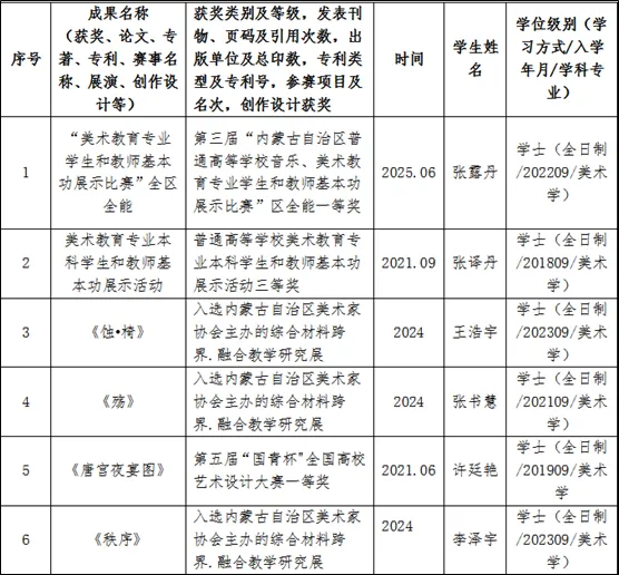 近年来,学院着力构建“教师引领、学生成长”的传帮带培养体系,通过打造专业竞赛指导平台、创作实践孵化平台和科研能力提升平台,形成了特色鲜明的人才培养模式。在“导师+项目”制的专业竞赛指导中,骨干教师团队指导学生获得内蒙古自治区美术教育专业基本功比赛一等、二等、三等奖共17项、“国青杯”等全国性艺术设计大赛奖项10项;通过“研究所工作制”教学模式,教师带领学生参与实际创作项目,3名学生作品入选内蒙古草原油画院写生展,4名学生参与自治区美协综合材料教学研究展,近百名学生作品入选各级美术与设计展览。实施“科研导师制”有效提升了学生的科研转化能力,这一平台体系的建设不仅培养了学生扎实的专业基本功和创新的艺术表现力,更促进了教师教学水平的整体提高,实现了教学相长的良性循环。