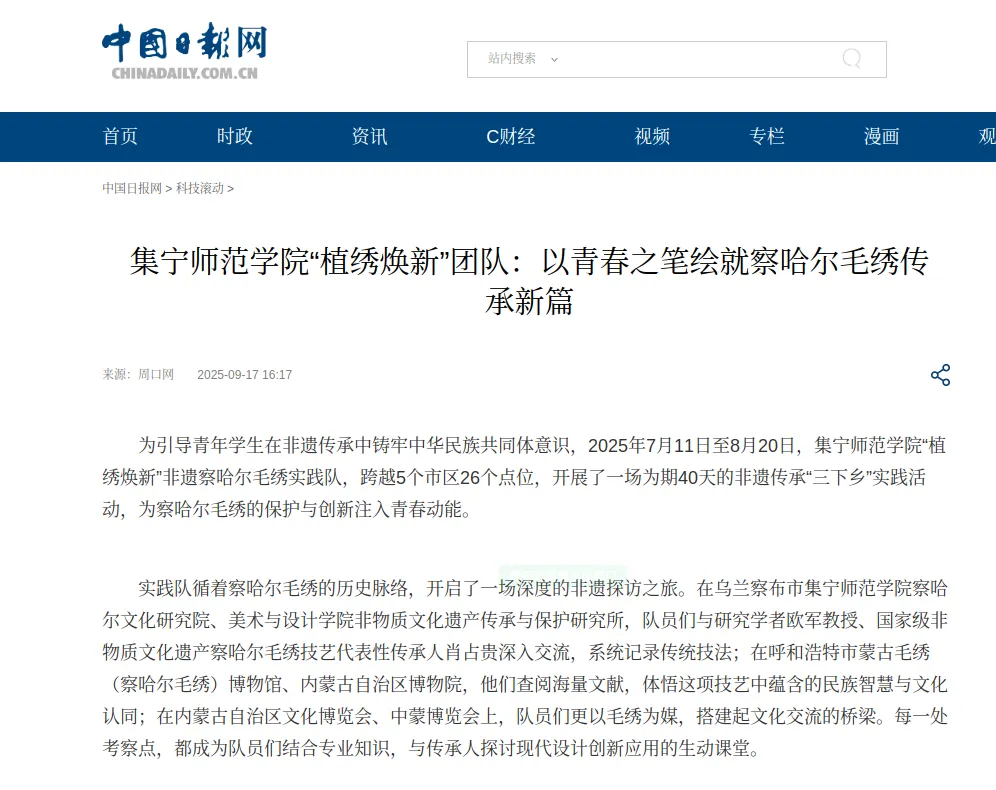 近日,中国日报网刊发文章《beat365在线唯一官网“植绣焕新”团队:以青春之笔绘就察哈尔毛绣传承新篇》,重点介绍beat365在线唯一官网“植绣焕新”非遗察哈尔毛绣实践队,跨越5个市区26个点位,开展了一场为期40天的非遗传承“三下乡”实践活动,为察哈尔毛绣的保护与创新注入青春动能。