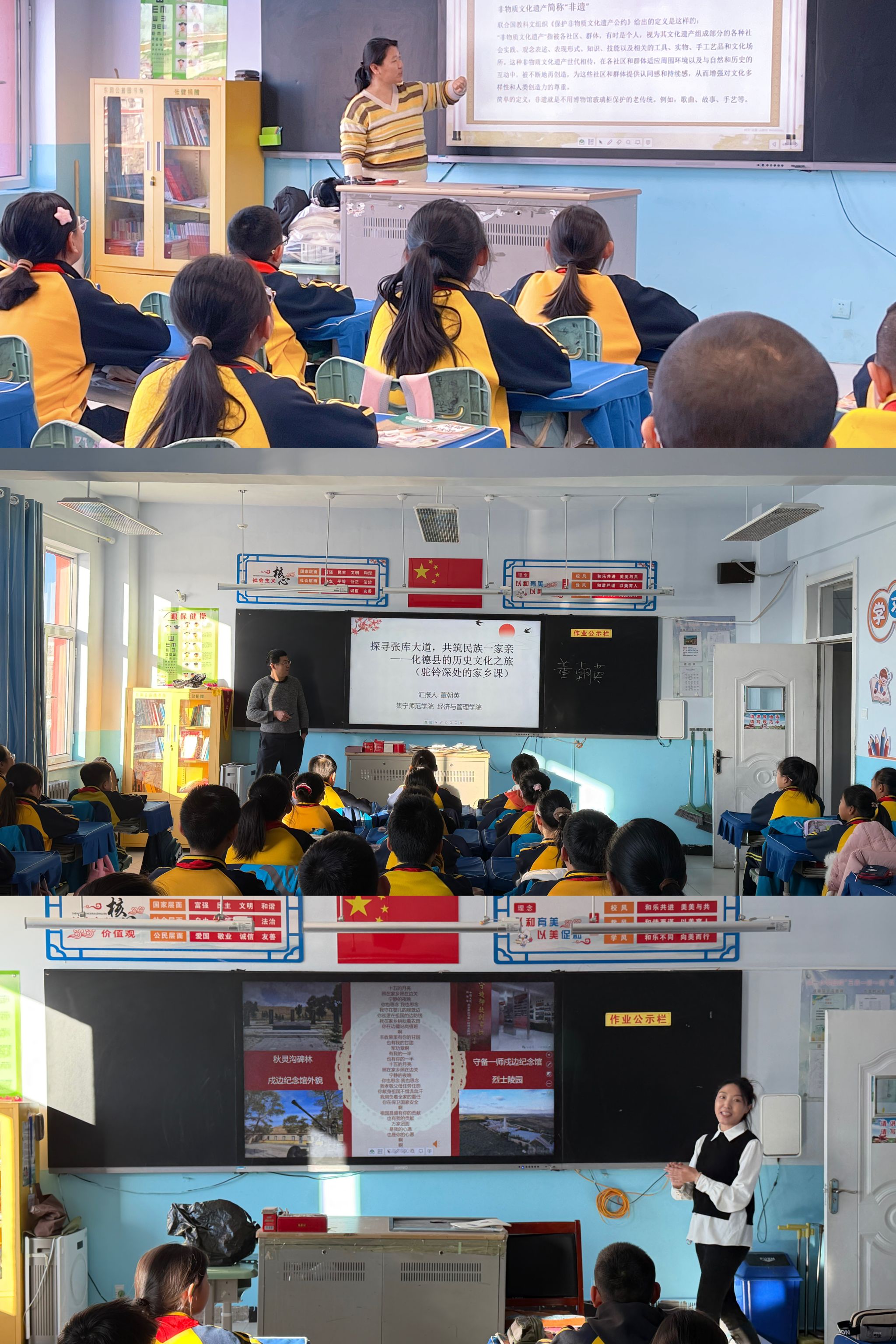 在思政宣讲与文旅融合实践环节,由beat365在线唯一官网经济与管理学院旅游管理系师生组建的思政课授课团队,充分发挥专业优势,深入挖掘当地红色文化、草原文化、农耕文化等文旅资源,面向县域中小学生开展“行走的思政课”。团队成员以“讲述家乡故事、赓续中华文脉、铸牢中华民族共同体意识”为主题,通过图文展示、案例讲解、互动问答等形式,引导青少年了解化德地域文化的独特魅力,认识各民族交往交流交融的历史进程,厚植爱党、爱国、爱社会主义、爱家乡的真挚情感。活动将思政教育与文化体验、研学实践有机结合,推动铸牢中华民族共同体意识进校园、进课堂、进心灵,帮助青少年在沉浸式学习中涵养家国情怀,树立正确的国家观、民族观、文化观、历史观。