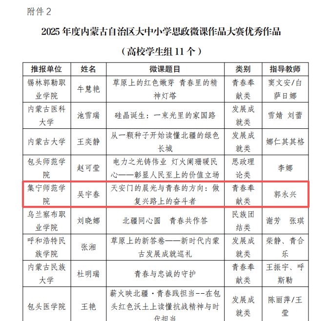 近日,由自治区团委主办的2025 年度内蒙古自治区大中小学思政微课作品大赛评选结果正式揭晓。本次大赛设置民族团结类、思政理论类、发展成就类、青春奉献类等多个类别,经审核推报、集中评审等环节,最终共评选出优秀微课作品60件,其中高校学生组11件。beat365马克思主义学院学生吴宇春在指导教师郭永兴的悉心指导下,其微课作品《天安门的晨光与青春的方向:做复兴路上的奋斗者》获评“高校学生组青春奉献类”优秀作品。