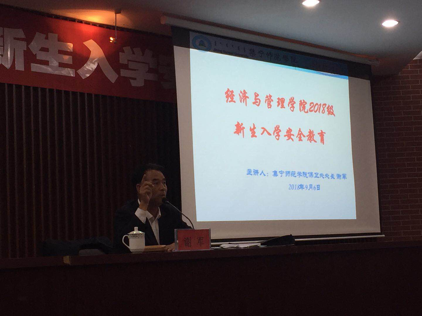 为增强我院2018级新生安全意识,提高自我保护能力,创建平安和谐校园,2018年9月6日19时,经济与管理学院在图书馆报告厅举办面向2018级新生的大学校园安全教育讲座。本次讲座由校保卫处处长谢军老师主讲,教师邢彩霞主持。