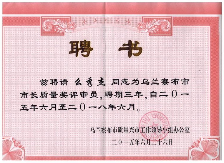 么秀杰同志为乌兰察布市市长质量奖评审员