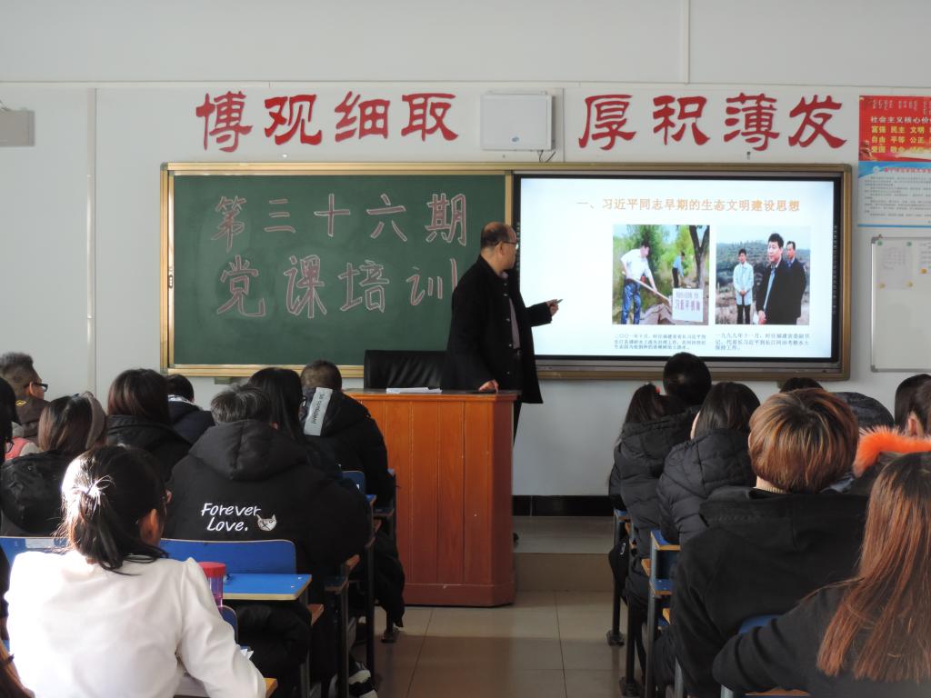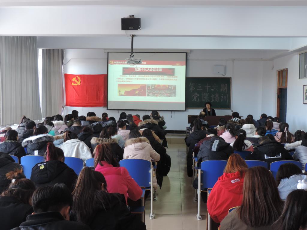 此次培训课程分别由郭萍、周关锁、张晓利、吴红春主讲。郭萍分别就十九大会议主要议题、报告框架结构、中国特色社会主义进入新时代的历史方位、新时代中国共产党的历史使命、习近平新时代中国特色社会主义思想和基本方略、开启全面建设社会主义现代化国家新征程等专题的重点内容和热点问题进行了深入解读。周关锁就习近平生态文明建设思想进行了讲解,对习近平总书记在福建浙江工作期间、十八大以来以及十九大的生态文明建设思想进行了解读。张晓利则就《中国共产党发展党员工作细则》进行了深入剖析,分别对《细则》修订的原因、内容、贯彻方法及中国共产党发展党员流程进行了详细讲解。吴红春则通过给同学观看《榜样》视频对同学们的思想进行了引导。