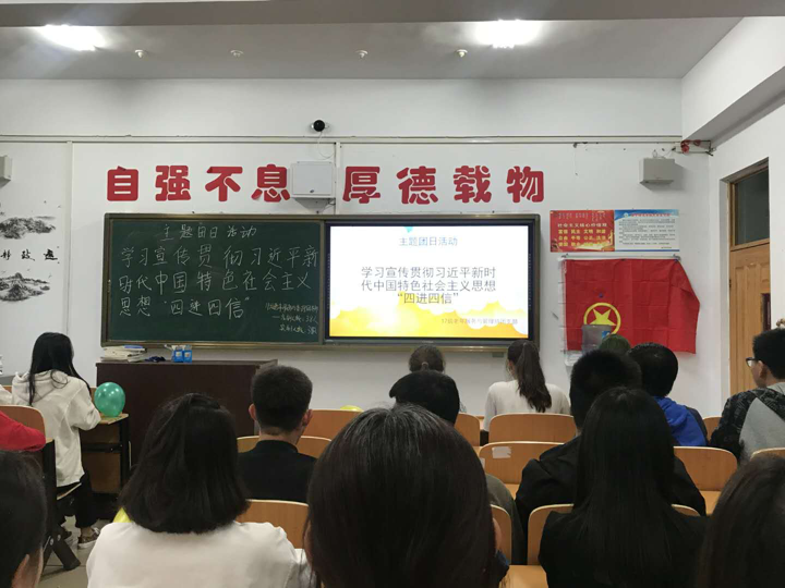 党的十九大将习近平新时代中国特色社会主义思想写入党章,确立为我们党必须长期坚持的指导思想。党有号召,团有行动。经济与管理学院团总支于2018年5月17日下午三点在主教楼218教室深入学习贯彻习近平新时代中国特色社会主义思想,举办“四进四信”主题团日活动。