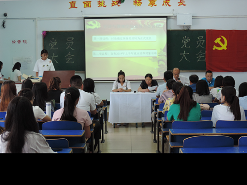 本次会议由党总支书记周关锁主持,大会共有二项议程。第一项议程是两名预备党员转为正式党员的决议,该项议程由学生党支部代理书记邢彩霞主持,首先由拟转正预备党员分别就各自预备期一年以来的工作、学习、生活等各方面情况做出基本介绍,并都表达了各自想成为一名正式党员的期望;接着分别由两位同志的入党介绍人对该同志为期一年的预备期内的情况作了说明,并表明了自己同意该同志成为正式党员的立场;全体党员对是否同意其转为正式党员进行无记名投票,最终两名同学顺利转为了正式党员;第二项议程是由党总支副书记张伟宣读2018上半年发展对象名单;最后由周关锁书记作总结发言。大会在庄严的国际歌的歌声中圆满结束。