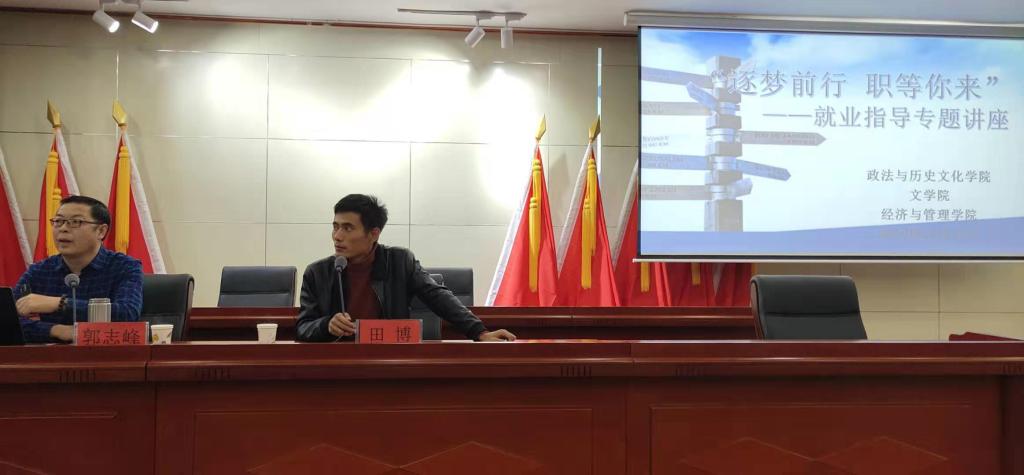 2019年10月31日下午,经济与管理学院、政法与历史文化学院、文学院在beat365在线唯一官网图书馆报告厅共同举办“逐梦前行,职等你来”就业指导专题讲座,邀请就业指导专家、北京广佳宏信管理咨询有限公司首席培训师、首席咨询师、内蒙古创业者协会理事郭志峰老师为同学们进行就业指导。本次讲座由田博主持。