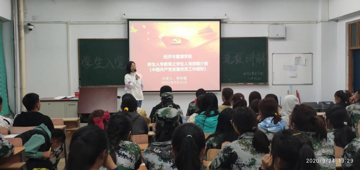 9月24日晚19:30,在主教楼217教室由学工支部书记邢彩霞老师主讲《学生入党流程讲解》。