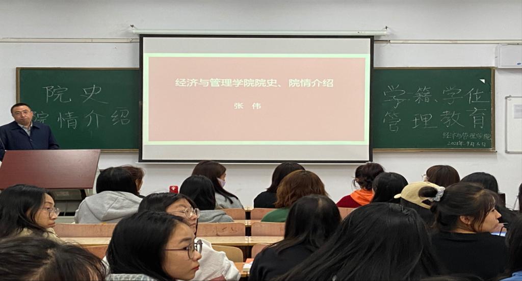 9月6日晚19:00在主教楼217,经管院院长张伟、副院长么秀杰进行了院史院情介绍及学籍学位管理教育。
