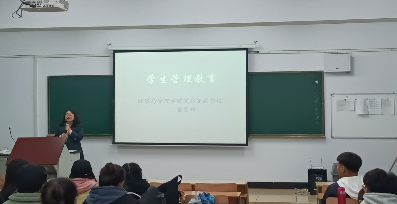 9月7日晚18:40在主教楼217由经管院党总支副书记苗雯娟、学工办负责人邢彩霞主讲《学生管理条例解读》和《大学生党团组织及大学生自组织介绍》。
