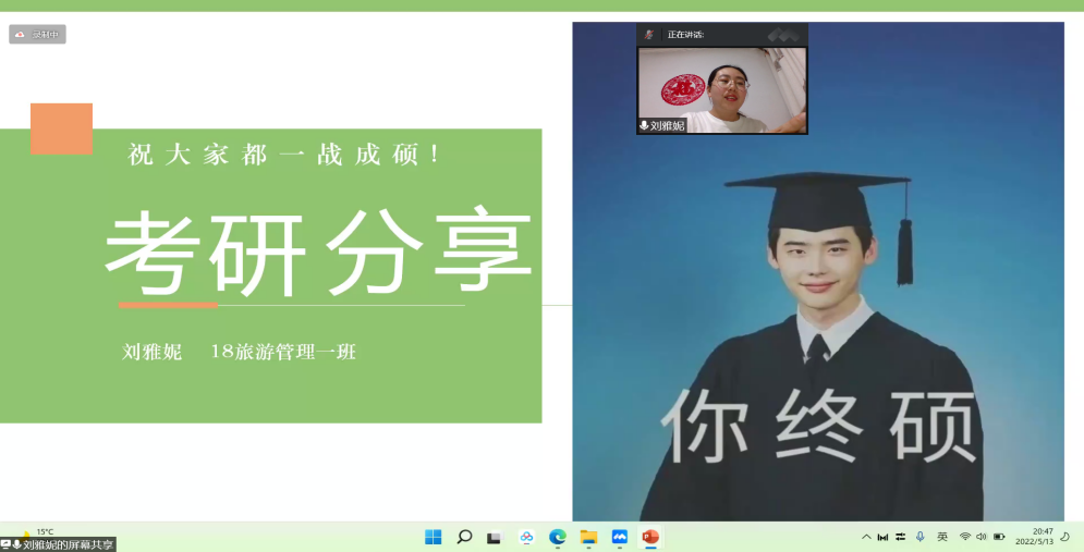 时光不负有心人,天道酬勤佳音来。为进一步加强学生对于考研的认识、激发学生考研热情,5月13日19点30分,经济与管理学院通过腾讯会议的形式,举办线上考研经验分享讲座。2018级旅游管理一班刘雅妮同学作考研经验分享,全体2019级学生参加了本次线上讲座。