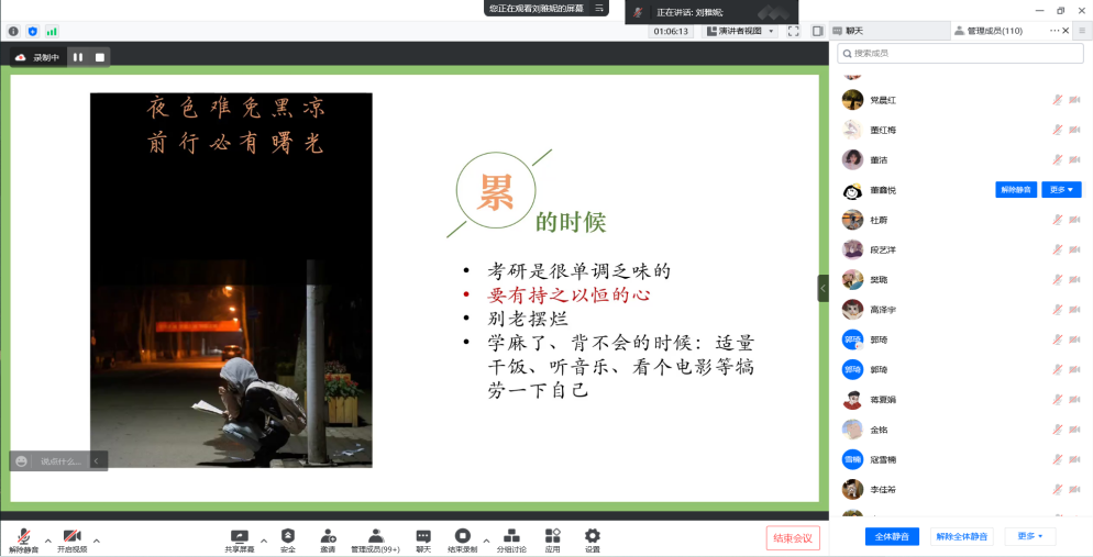 本次考研讲座中刘雅妮贴近现实,生动举例,让同学们受益匪浅。同学们都纷纷表示,将在考研路上不懈努力,实现自己的人生理想。