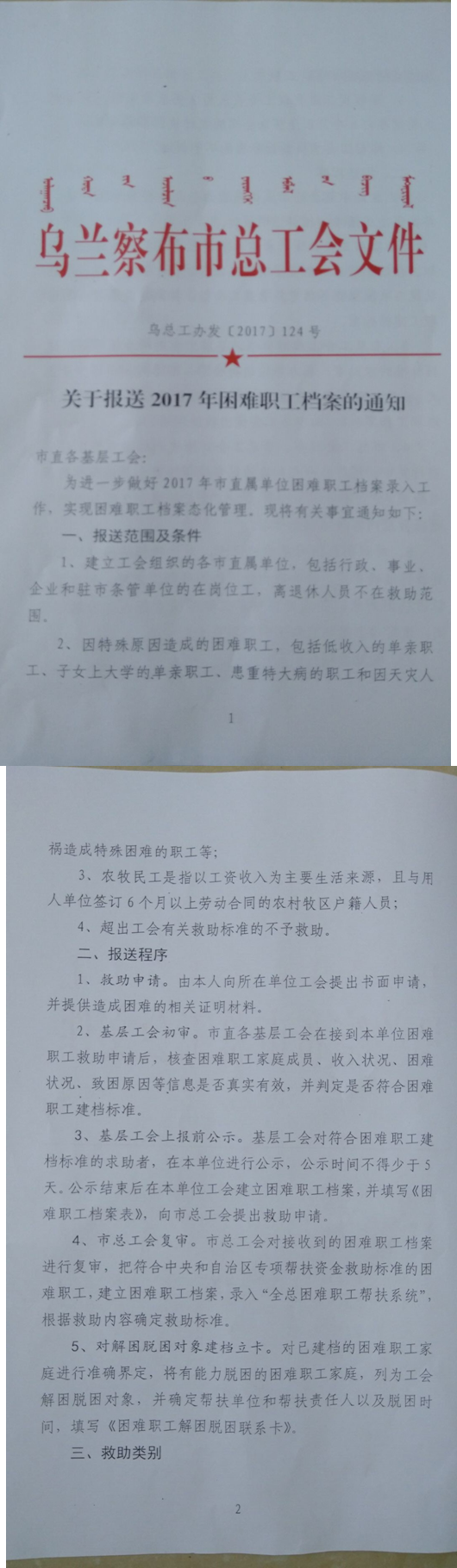 现将乌兰察布市总工会《关于报送2017年困难职工档案的通知》转发,请符合文件要求的教职工,务必在10月10日前将材料报到行政楼506工会办公室,逾期无法办理。